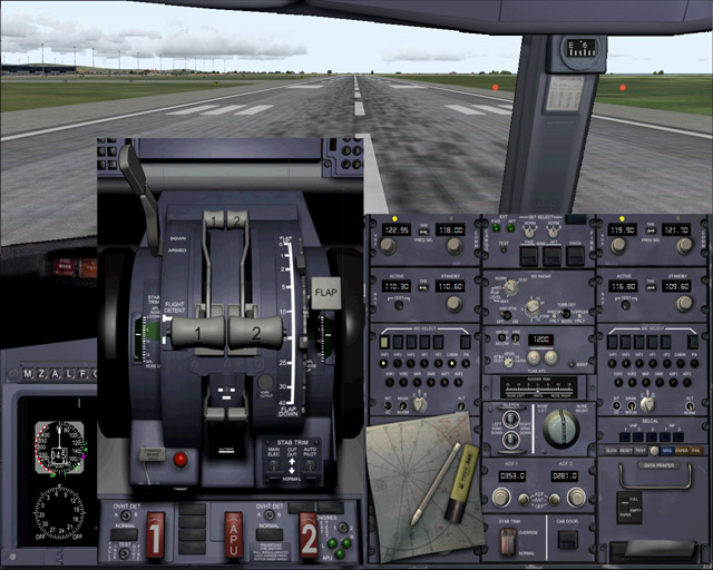 Cocodrine: te mostraré pantallas del Airbus 340 de PSS...Po cierto, que muchos hemos comprado la cabina a PSS y la utilizamos con otros aviones, especialmente los de IDFG...(o sea, un freeware que supera al modelo del avión de pago). Esta cabina 2D -y 3D en los modelos de PSS- del airbus 330/340 es sencillamente lo mejor que he visto en Airbus.