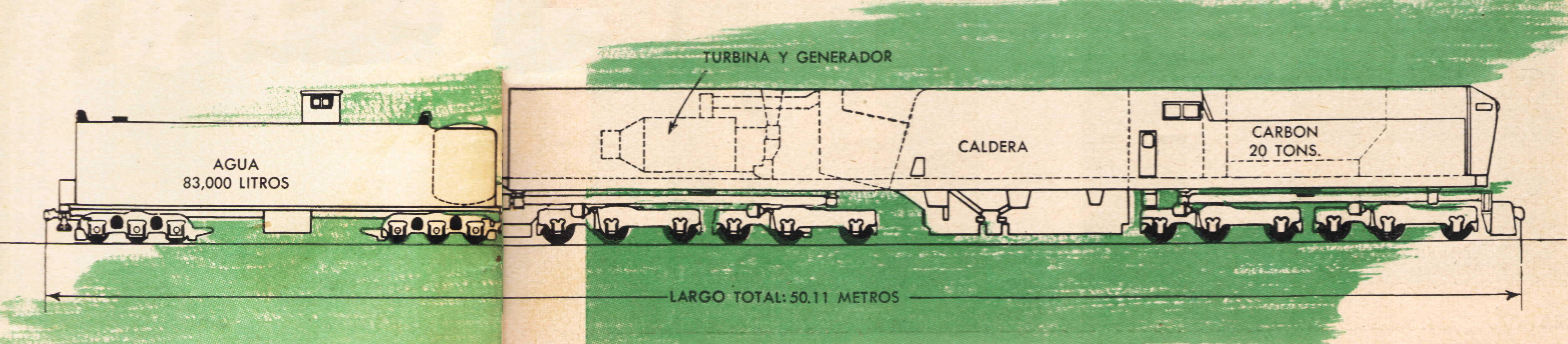 Además, muchas de sus partes están dispuestas en forma distinta a la acostumbrada. El carbón, por ejemplo, esto es 20 toneladas de dicho combustible, se almacena en un compartimiento en la máquina misma, delante de la cabina de conducción. Detrás de ésta se halla la caldera, y a continuación la turbina y el generador. El ténder contiene solamente agua (83.000 litros) y un suavizador especial; en la parte superior tiene una cúpula para el guardafrenos.