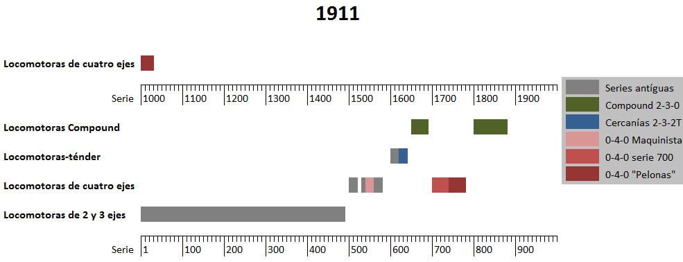 Ya hemos visto el cambio en la tracción planteado a partir del 1901, y como una década después, y fruto del informe sobre mejoras de la tracción, se consolidan las 2-4-0 en simple expansión y vapor recalentado para mercancías, mientras que en pasajeros existe una apreciable duda entre los tipos 2-3-1 y 2-4-0 ambos en doble expansión. Todo parecía ir empezando a encajar hasta que estalla la primera guerra mundial...