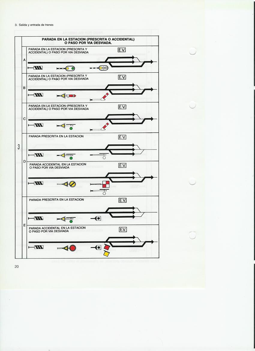 Aquí la presentación es por la forma de recibir al tren, no por la forma de las señales, con lo que es más didáctico, a parte de ser mejores los esquemas, como corresponde al avance de las tecnologías gráficas de 30 años. Pero no baja tanto al detalle de poner la señal de paso o de parada a mano para la parada accidental por el jefe de estación en el eje del edificio de viajeros.