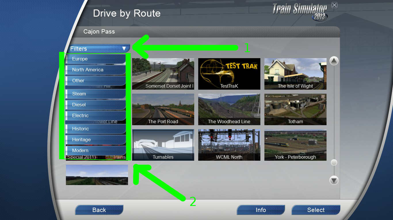En el menú principal, selecciona un jugador y después el tipo de escenario que deseas. Te aparecerá una lista con los escenarios y dos miniaturas arriba a la izquierda. Pulsa en el botón debajo de la ruta que haya seleccionada. Después pulsa en filtro (1) y selecciona todo lo que haya (2):