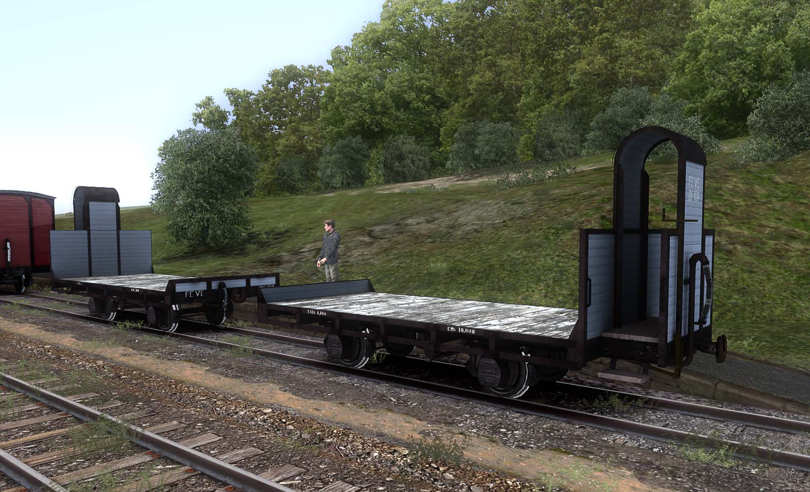 En primer lugar una plataforma de dos ejes, recuperada de un modelo anterior de MSTS/Trainz, un poco trabajados luego. El nivel de detallado no es muy alto y de momento no llevará numeración interactiva, aunque si mejoras en las mallas, render to texture, enganches operativos, carga y sonidos para RW.