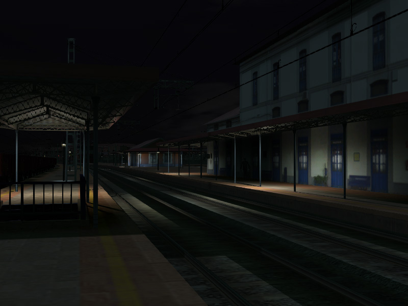 En una primera aproximación al tema he procedido a colocar unas cuantas 'farolillas' con las luces que incluye el TS2012 por defecto en el editor. A pesar de su enorme potencia y el aspecto tétrico sirvan estas capturas para mostrar el principio de lo que se podría conseguir con el nuevo motor del simulador. Habrá que investigar valores para poder hacer que esta bonita estación luzca en la noche como merece. Siento la calidad de las capturas, pero mi ordenador va muy justito y con tantas luces y tantas sombras no he conseguido moverme con soltura (1 fps cada 2 segundos es una tortura para moverse).