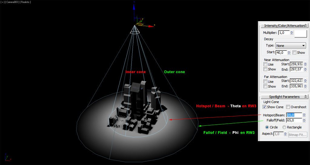Dentro del cono interior (Inner cone), con el ángulo definido en "Hotspot/Beam" o "Theta" en Directx y RW3, la luz impacta con la máxima intensidad en la zona del círculo interior. La intensidad de la luz va decreciendo hasta llegar a 0 en el espacio delimitado por el cono exterior (Outer cone) según su ángulo definido por "Fallof/Field" o "Phi" en Directx y RW3, delimitando por el cículo exterior la zona a partir de la cual no hay luz.