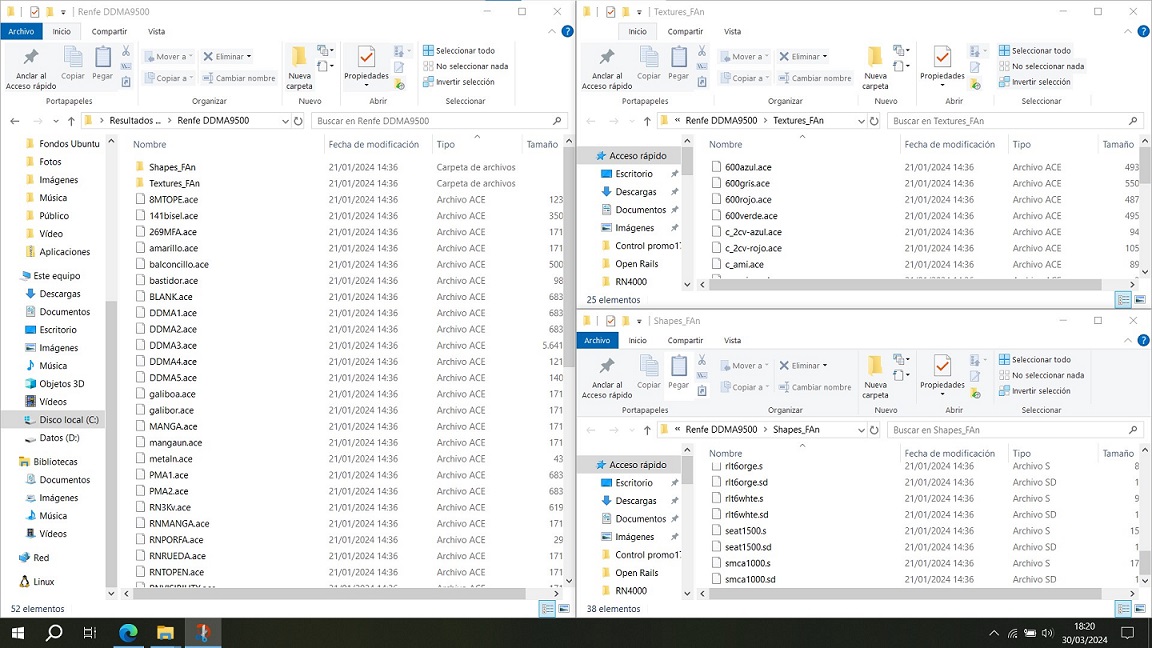 Mr TER, yo tengo, en la misma carpeta del vagón, los .s, .sd y ACE, todos juntos, y me funciona perfectamente. Echa un vistazo al WAG, por si hay algún error. Yo tengo los coches puestos así.