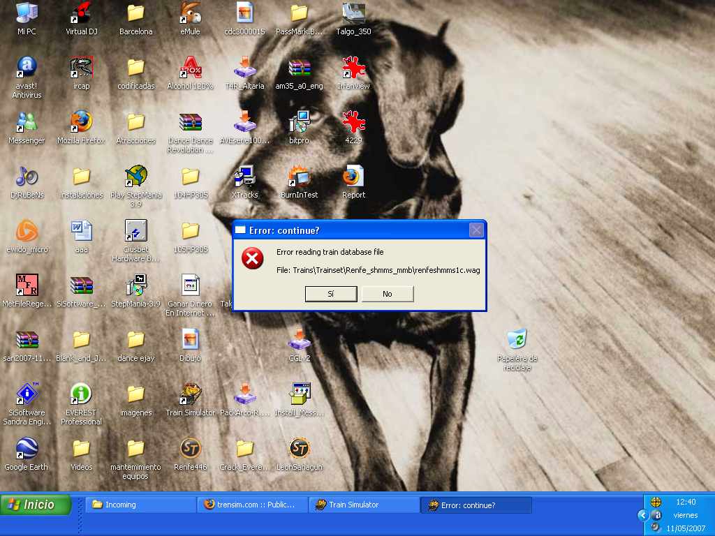 Lo primero cuando abro el simulador me aprecen varios errores por lo menos unos 8 errores y tendo k darle a si para continuar hasta k me aparezca el menu, y eso desde que meti creo la ruta leon sahagun, segundo cuando kiero hacer la ruta k pone talgo madrid-gijon en la ruta leon sahagun, me sale esto, la de explorar k es leon sahagun me va bien pero la ruta esa k pone talgo madird-gijon me da error y ya me paso tambien con otra ruta k instale no se cual. No os pongo todos los errores k me da al abrir el simulador xk son muchos pero pa k veais os pongo los dos primeros.