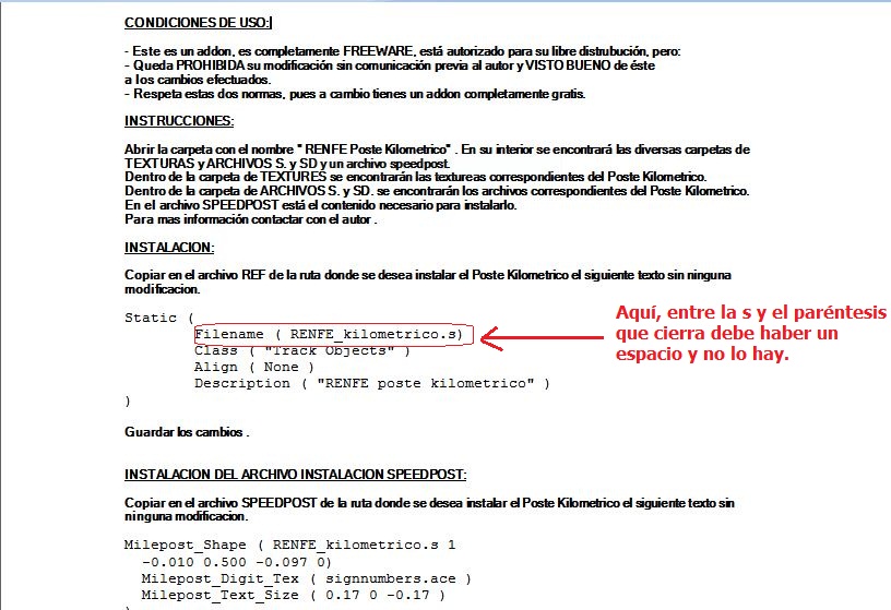 He mirado las instrucciones del poste kilométrico que quieres instalar y he detectado un error en lo que debes copiar al archivo .ref, y es lo que te indico en la captura siguiente: