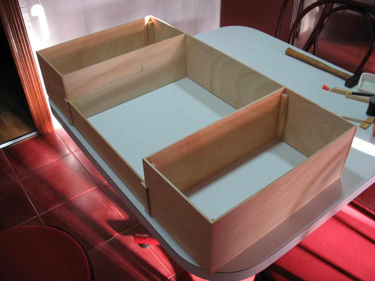 En este caso, se trata de simples tableros de contrachapado de 5 mm de espesor, cortados a las medidas necesarias y de unos listones de 10x10mm para hacer las escuadras y los apoyos. La dimensión del pupitre en total es de 80x40x15 cm.