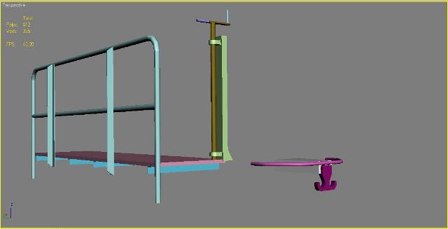 He realizado también una barandilla, pero esta vez mediante piezas en lugar del comando Soft. Primero hice los cilindros rectos, a los cuales les he bajado segmentos y lados, para reducir los polys. Lo mismo he realizado con el toroide. A continuación fuí juntando las piezas como haría un soldador, finalmente he hecho una Union al conjunto mediante Boolean.