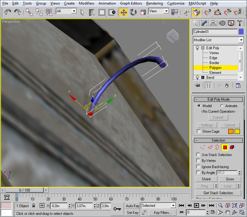 Desplazaremos el cubo hasta la posición de la ventana. Esto lo podemos hacer mediante "Select and Move" y, en la vista lateral, pinchando con el ratón sobre las dos flechas, verde y roja, que aparecen sobre el "pivot" del cubo.