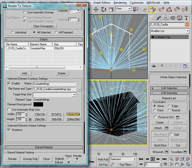 Ahora que ya tenemos los dos elementos de la casilla para sus respectivos LODs, ocultaremos, tal como hemos hecho antes, el LOD lejano 2_1250_Casilla, dado que este elemento ya tiene la malla que queremos. Nos dejaremos visible el LOD cercano 1_0128_Casilla para trabajar en él e incrementar su detalle como corresponde a su visión de cerca.