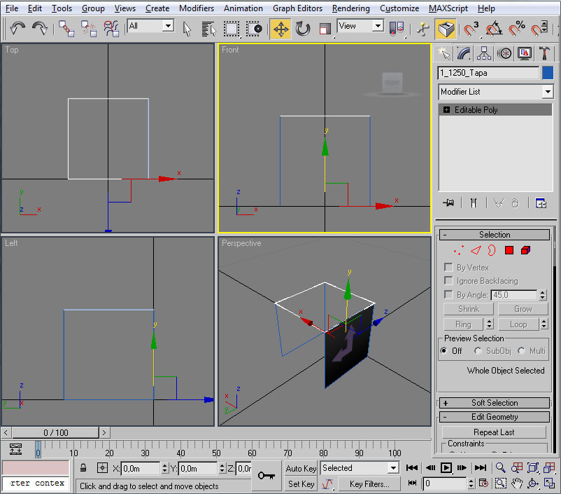 Una vez aceptado que este shader sólo trabaja en una de las caras, corregir el segundo efecto es tan sencillo como separar el polígono afectado (Dettach) y girarlo 180 grados en el eje Y, teniendo presente que al final de la operación el eje de este nuevo elemento debe estar en las coordenadas origen de la escena (0,0):