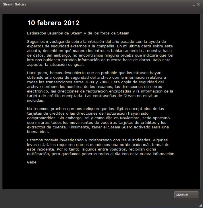 Nos hemos percatado de que, además de los foros, los intrusos consiguieron acceder a la base de datos de Steam. Esta base de datos contenía información como nombres de usuarios, contraseñas encriptadas, compras de juegos, direcciones de correo electrónico, direcciones de facturación e información encriptada de tarjetas de crédito. No disponemos de evidencias que nos digan que los intrusos sustrajeran los números de las tarjetas de crédito o la información personal de los usuarios así como que la protección de las tarjetas o contraseñas fueran pirateadas. Aún estamos investigando.