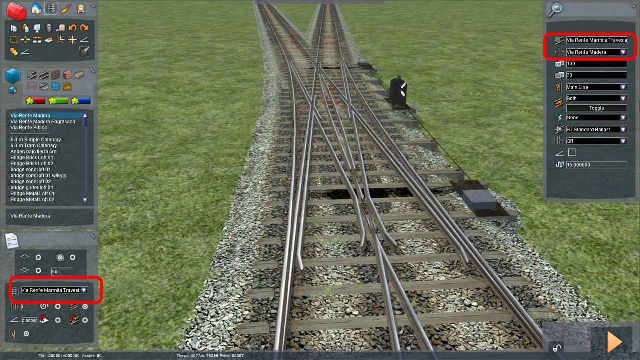 ComplementosTodas estas vías pueden mostrar una catenaria de doble hilo de contacto. La altura del hilo de contacto se ha establecido en 5,300 metros, superior a la altura que presenta la catenaria en las rutas europeas del simulador, pero ajustado al valor utilizado en Renfe. La catenaria aparecerá al tender vía con la opción “Electrification” con el valor “Overhead Wires”.
