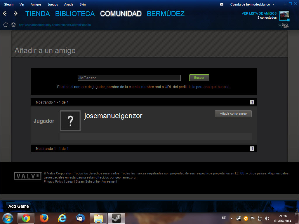 Te estoy buscando por JMGenzor, y el resultado que arroja el cliente Steam es que no se encuentra nadie registrado bajo ese nombre.